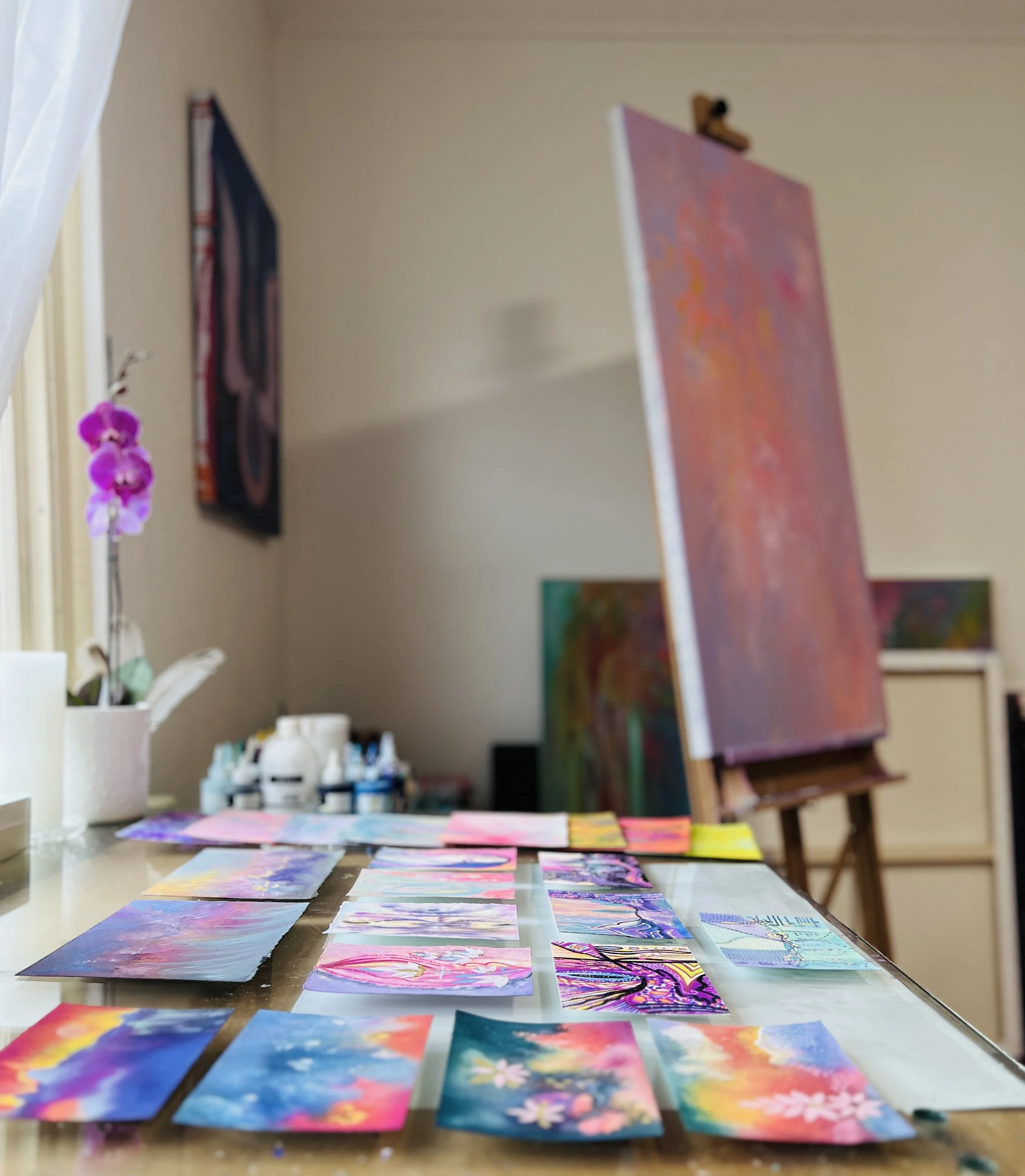 These postcards invite you to pause, explore, and witness the subtle magic of creation . A microcosm of growth, light, and wonder captured in small scale original artworks. Each work can be collected individually, yet together they form a constellation of imagination, energy, and tender vibrancy.